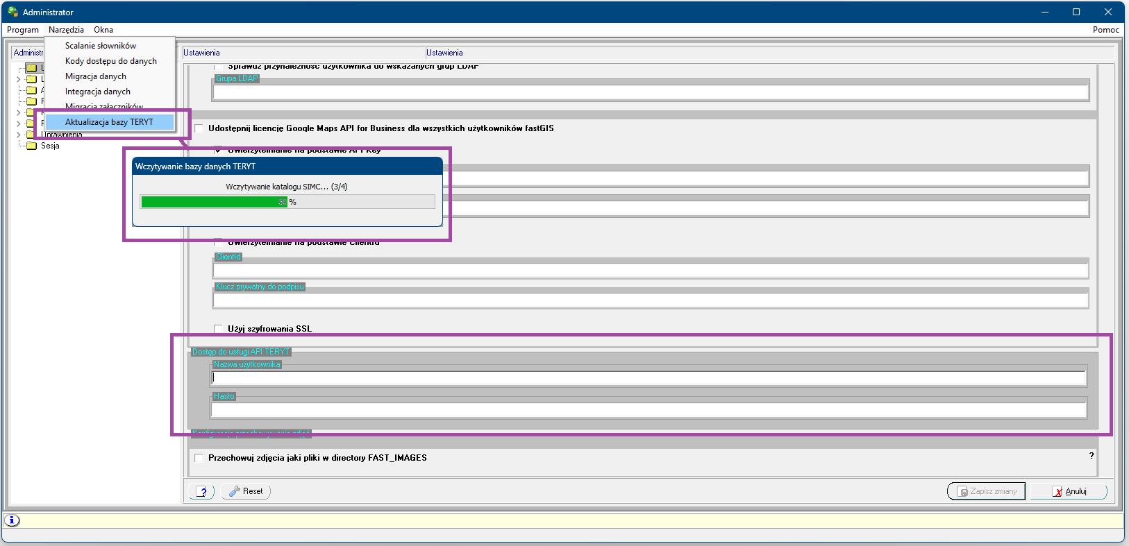 Administrator systemu ma teraz możliwość automatycznej aktualizacji danych adresowych i kodów TERYT w fastGIS z wykorzystaniem API TERYT (https://api.stat.gov.pl/Home/TerytApi). Wystarczy użyć narzędzia "Aktualizacja bazy TERYT" w programie fastAdministrator. Do skorzystania z API TERYT konieczne jest założenie konta dostępu do tej usługi zgodnie z instrukcją udsotępnioną na stronie https://api.stat.gov.pl/Home/TerytApi w rozdziale Rejestracja.