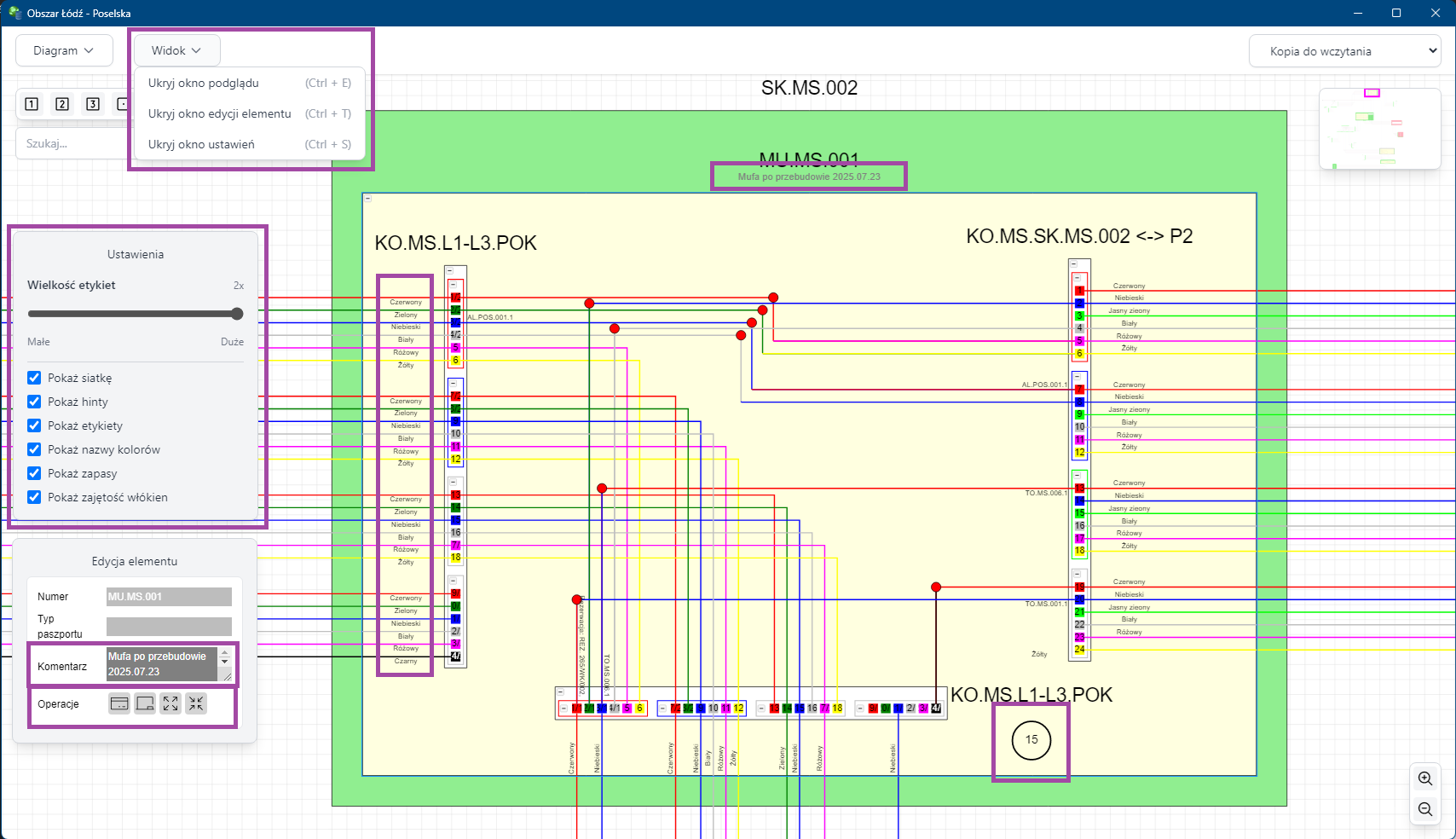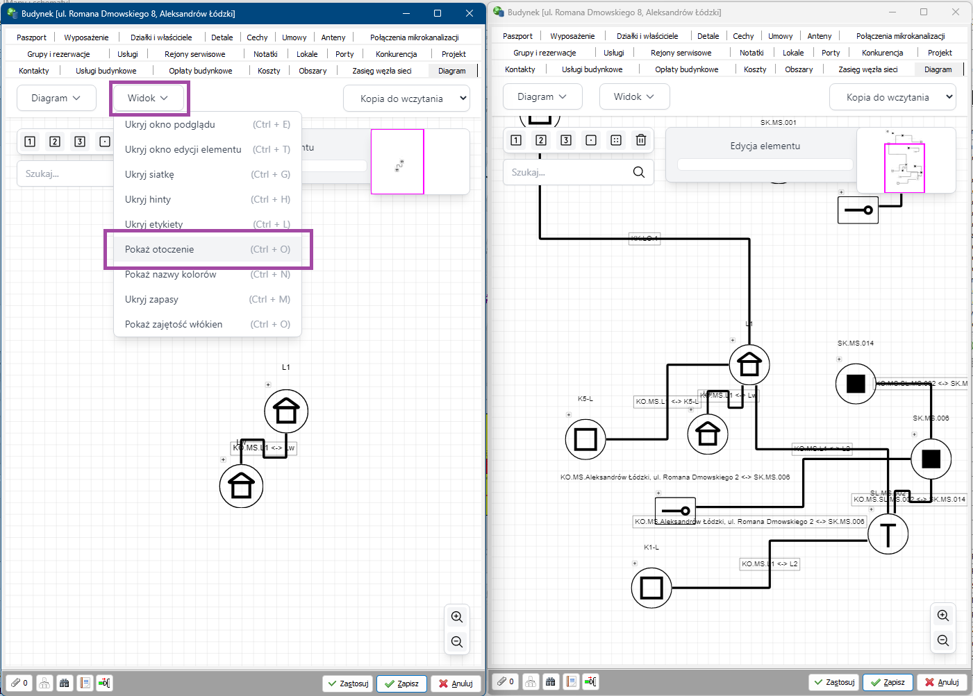Wprowadzono wiele ulepszeń oraz nowe elementy interfejsu uzytkownika w diagramach elementów sieci i połączeń: