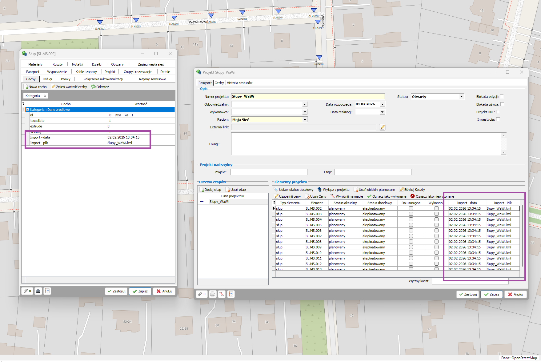 Informacje w obiekcie i projekcie o dacie importu i pliku, z którego został zaimportowany