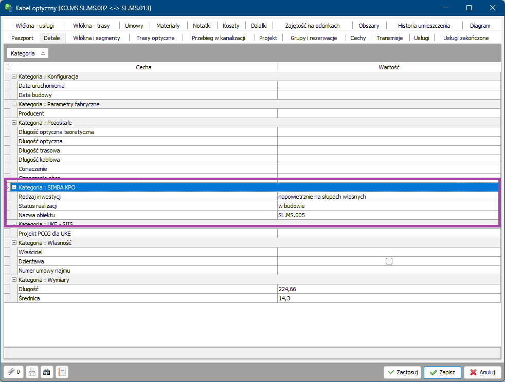 W kablach powjawiły się informacje przeznaczone dla systemu SIMBA zgodne z wymaganiami dla importu plików z formatu CSV i SHP. Eksport plików SHP w fastGIS pozwoli na wyeksportowanie obok przebiegu kabla również danych z nowych detali przeznaczonych dla SIMBA.