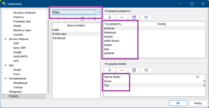 W ustawieniach programu mozna teraz skonfigurowac samodzielnie etykiety (identyfikatory) dla obiektów pojawiających się na mapie, na diagramach i w aplikacji przeglądarkowej fastWEB. Wystarczy utworzyć konfigurację, w której okreslamy dla jakich typów obiektów będzie ona zastosowana i jakie detale (pola) będą widoczne w etykiecie. Gdy dla danego typu paszportu nie będzie wprowadzana żadna konfiguracja wówczas etykiety pojawią się takie jak w poprzednich wersjach.