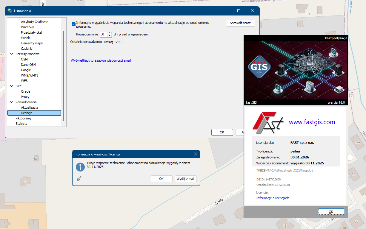 Program fastGIS sprawdza teraz przy uruchomieniu ważność wsparcia i abonamentu i jeżeli okres wspracia zbliża się do końca (domyślnie ostatnie 30 dni) wówczas użytkownik zostanie o tym poinformowany. Informacja o dacie ważności wsparcia jest też dostepne w ustawieniach programu w sekcji Licencje oraz w oknie pomocy programu. Użytkownik z poziomu okna komunikatu ma możliwość przygotowania wiadomości e-mail o chęci odnowienia lub przedłużenia okresu wsparcia.