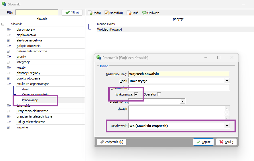 Konfiguracja wykonawcy jest dostepna z poziomu okna słowników