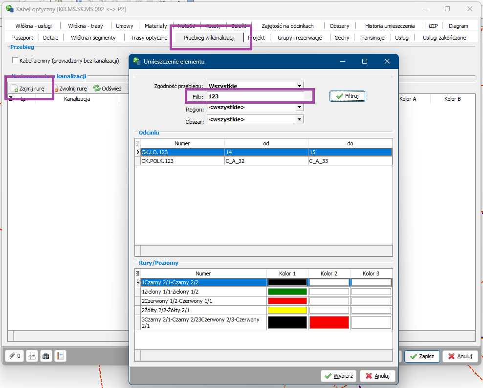 W oknie wprowadzania kabla do rury pojawił sie filtr pozwalającyu na ograniczenie listy odcinków lub wyszukanie odcinka o zadanym numerze.