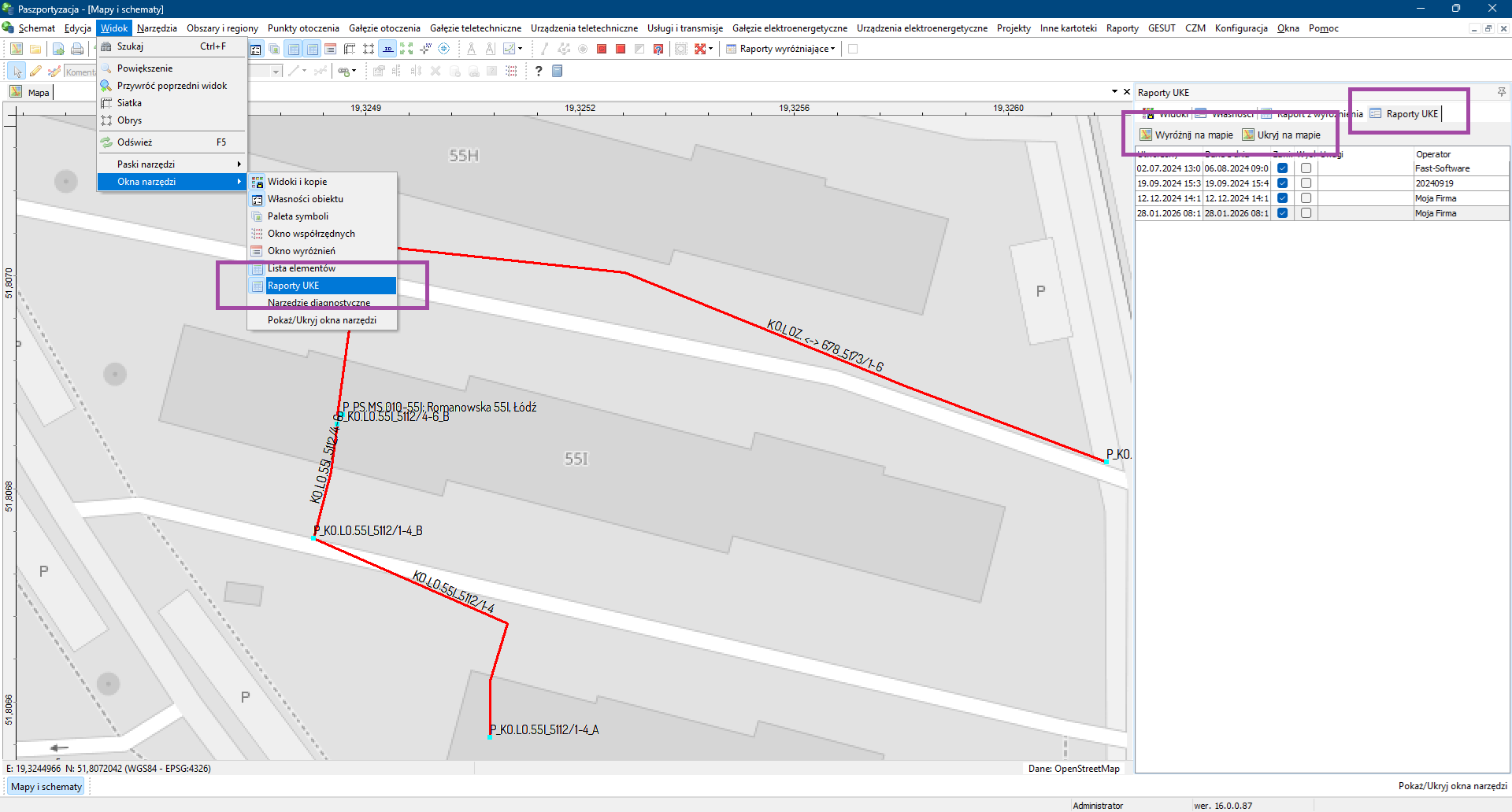 Udostępnione zostało nowe okno narzędziowe mapy "Raportu UKE", które pozwala na prezentację na mapie danych, które znajdują się w wybranym raporcie do UKE PIT. Opcja wyróżnienia danych raportu działa niezaleznie od ustawień widoczności elementów i warstw na mapie i uzytkownik może zdecydować czy chciałby widzieć wyróznienie raportu na wrysowanych na mapie danych czy też same dane raportu na tle mapy.